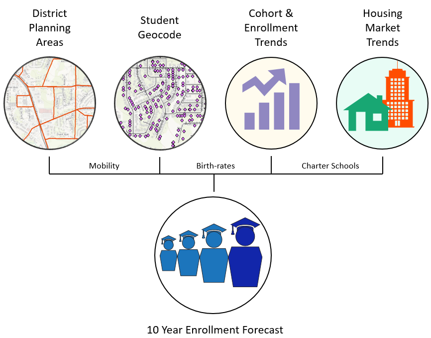 Zonda Education will evaluate options for future school sites. We review current school locations, current students and future student locations based upon future housing data by using ArcGIS tools. With the combination of enrollment projections data and G.I.S. software to build 5 or 10-year facility plans. Focus is on when and where to build schools or how to re-purpose schools.
